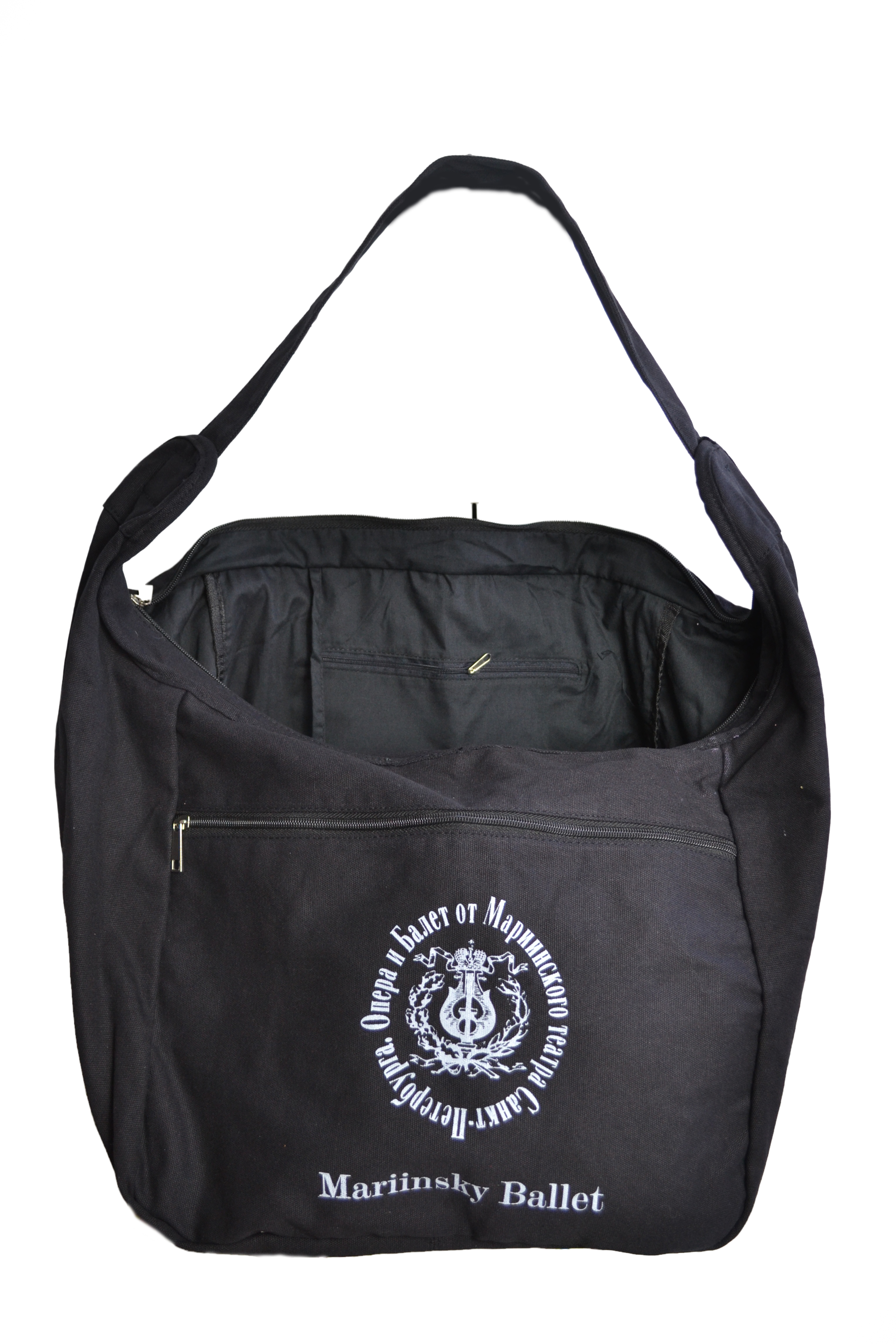 This ballet bag is great for ballet class, with a large shoulder strap and big front zip pocket featuring the Bolshoi Ballet logo in silver. It has lots of space inside with two large inside pockets and a handy clip to easily locate your keys! 100% Cotton Canvas Size: 50 x 30 x 30 cms: 20 x 12 x 12 ins As sold at the Royal Ballet shop Covent Garden.